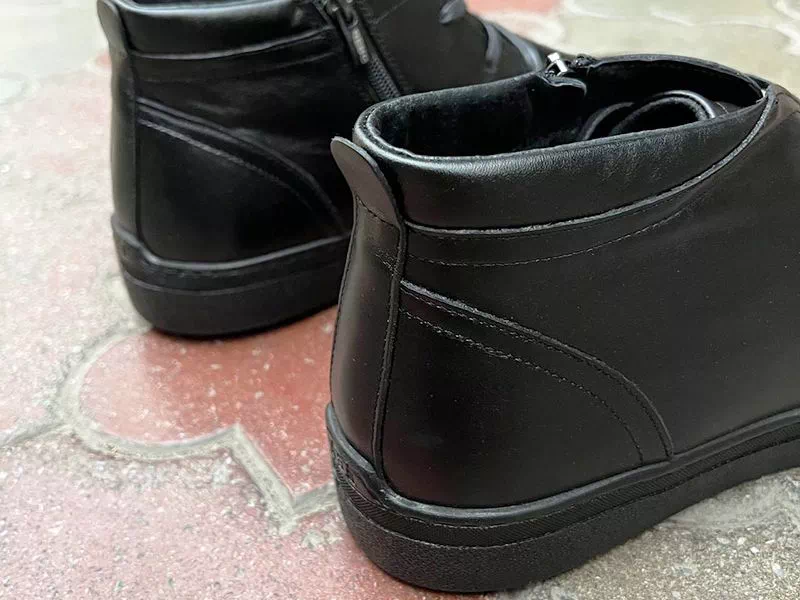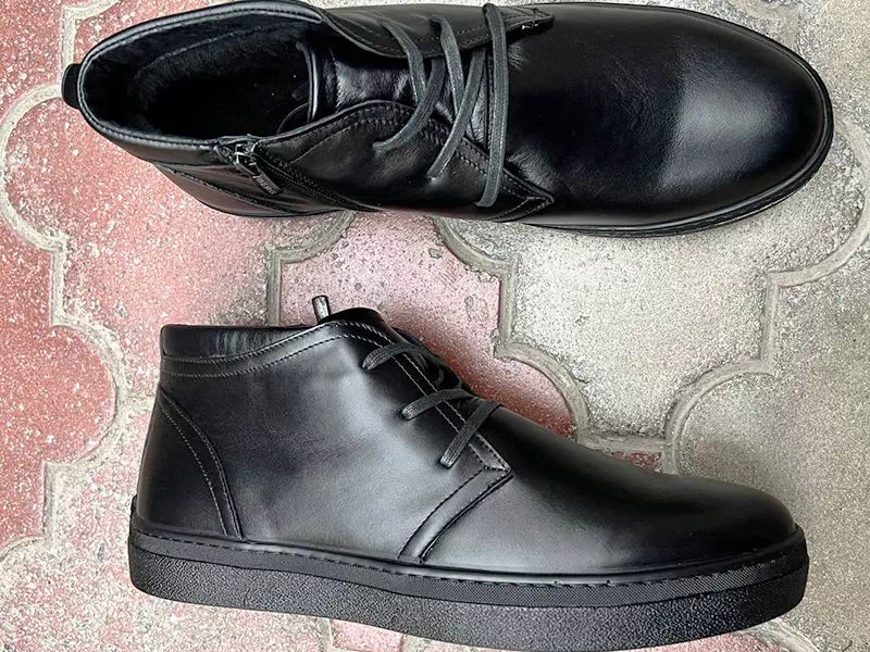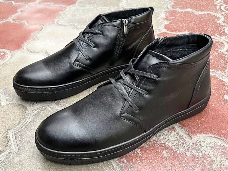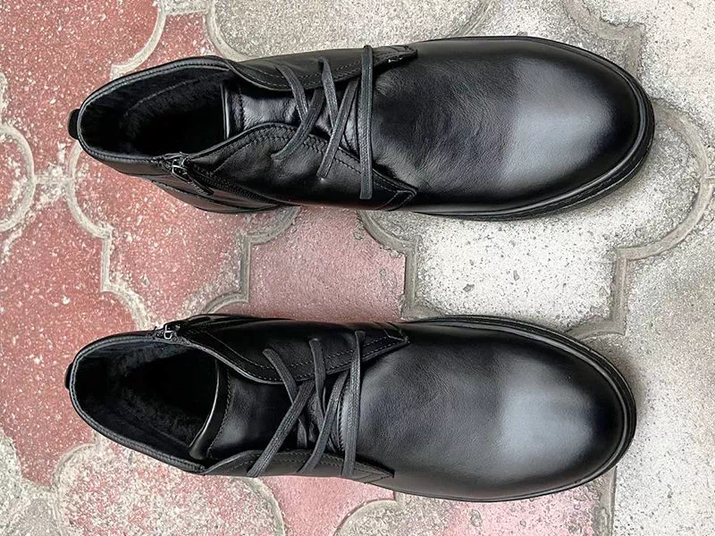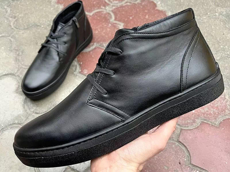 Пошиті з натуральної шкіри хромового дубління. Утеплювач з набивної вовни добре утримує тепло всередині. Стійка до затирання підошва ТЕП має чудові амортизаційними властивості. Прошиті та проклеєні по всьому периметру. Фіксуються на нозі шнурівкою. Блискавка з внутрішнього боку додає зручності. Каблук – відсутній. Країна виробник – Україна.