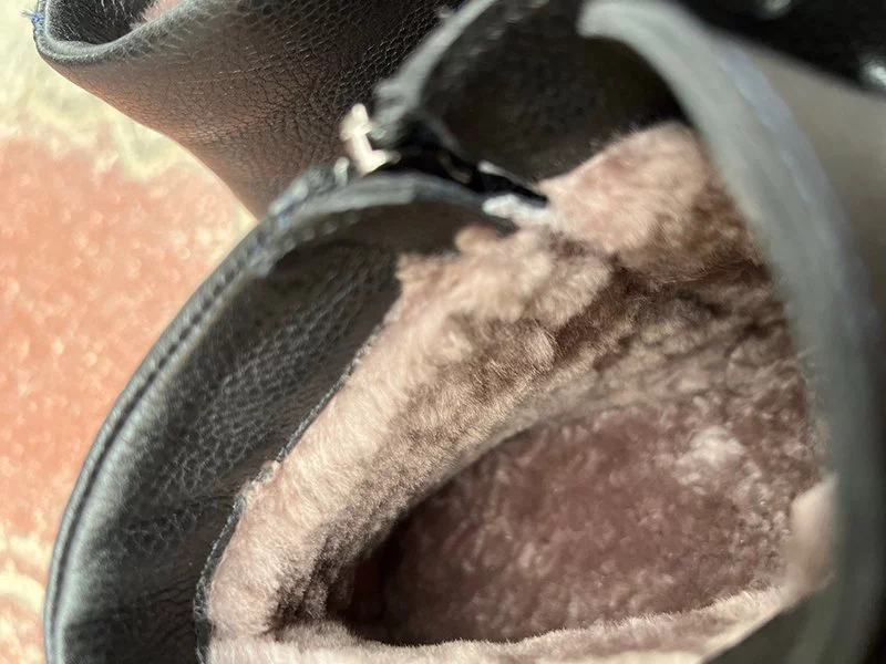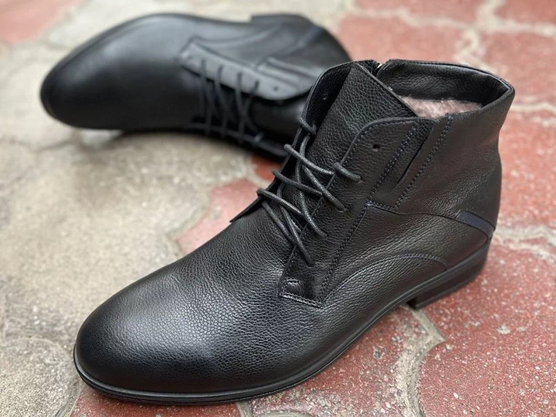 Пошиті з чорної зернистої натуральної шкіри хромового дубління. Всередині утеплювач – натуральне хутро (цигейка). Міцна та морозостійка підошва ТЕП з прекрасними амортизаційними характеристиками. Каблук – стандартної висоти. Фіксація на нозі – шнурівкою. Блискавка з внутрішнього боку додає зручності. Країна виробник – Україна.