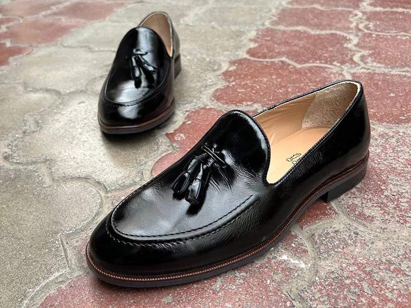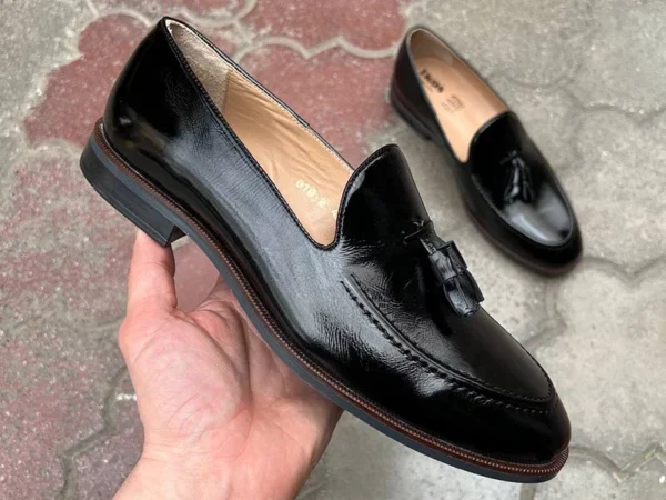 Пошиты из лакированной натуральной кожи наплак. Внутри – кожаные подклад и стелька. Устойчивая к истиранию подошва ТЭП имеет прекрасные амортизационные характеристики. Каблук – стандартной высоты. Не скользят, не промокают – можно использовать во влажную, дождливую погоду. Украшены декоративными кисточками. Страна производитель – Украина.